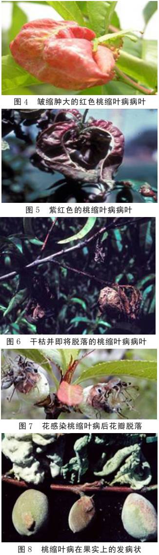 桃縮葉病在桃樹的枝干、葉片和花器及果實(shí)上均可表現(xiàn)出癥狀(圖1)。