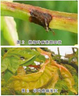 桃樹苗枝梢受害呈灰綠色或黃色,較正常枝條短,而且較粗腫,頂端葉片常叢生,發(fā)病嚴(yán)重時(shí)病枝逐漸向下枯死,甚至有的大枝枯死或全株枯死(圖2)。
